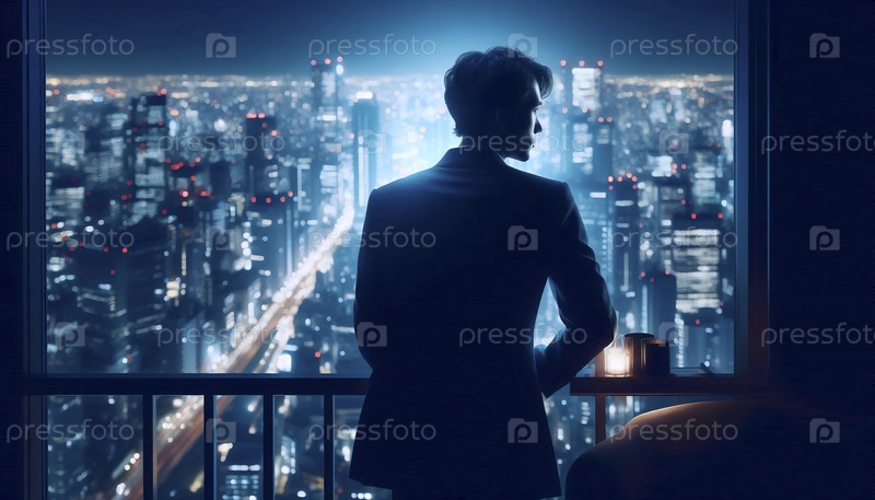 Момент предпринимательских амбиций с видом на яркий, ночной городской пейзаж Ай создал образ