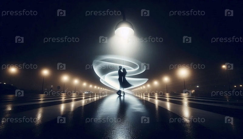 Фото длительной экспозиции пары, танцующей на улице под дождем, Ai generated image
