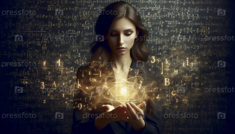 Женщина, окруженная светящимися математическими формулами, Ai generated image