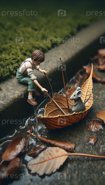 Мальчик, плавающий на лодке из листьев с пассажиром мыши в канаве, Ai generated image
