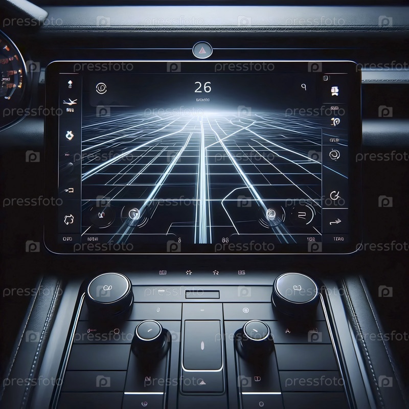 Мокет автомобильной информационно-развлекательной системы с пустой картой и чистыми значками, в темном интерьере машины Ай создал изображение