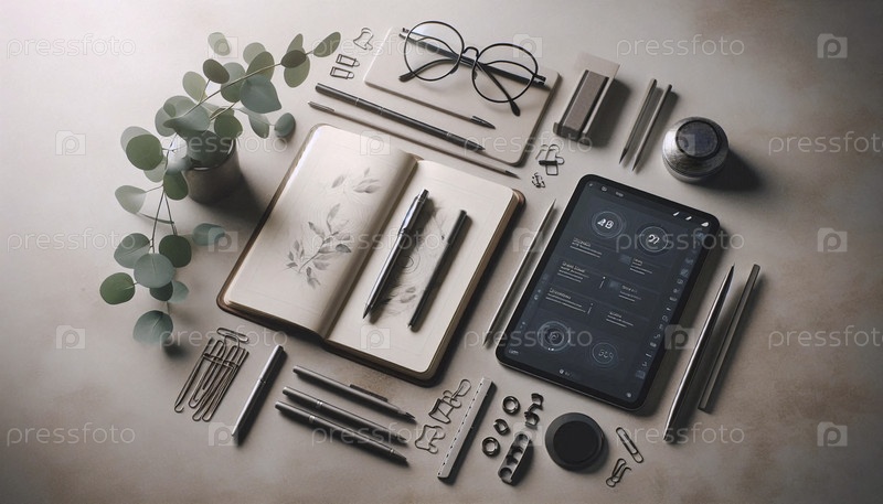 Детальный, амбициозный снимок курируемого рабочего пространства для творческого потока, Ai generated image