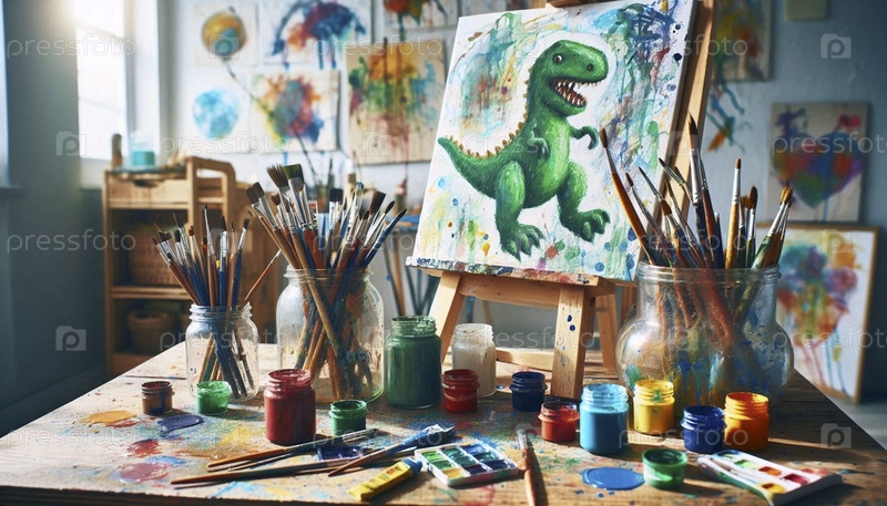 Творческая художественная станция: небольшая эстафета с красочной живописью, банки кистей и разлитые акварели, Ай создал изображение