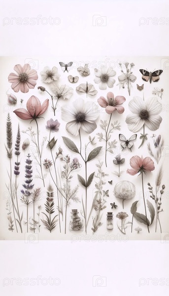 A dried flowers herbarium art print, Ai generated image А сушеные цветы гербария художественная печать, Ай создал изображение
