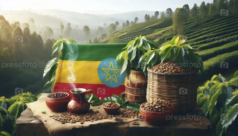 Эфиопский флаг на церемонии кофе и фермах в высокогорных районах, Ai generated image