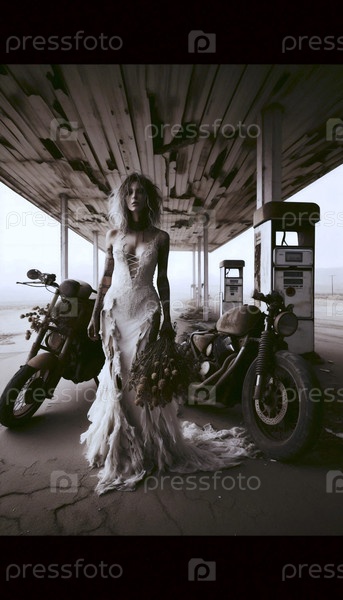 Постапокалиптическая невеста на заправочной станции, Ai generated image