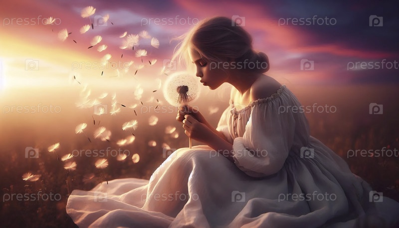 Принцесса, делающая желание на одуванчике акварельный арт-принт, Ai generated image