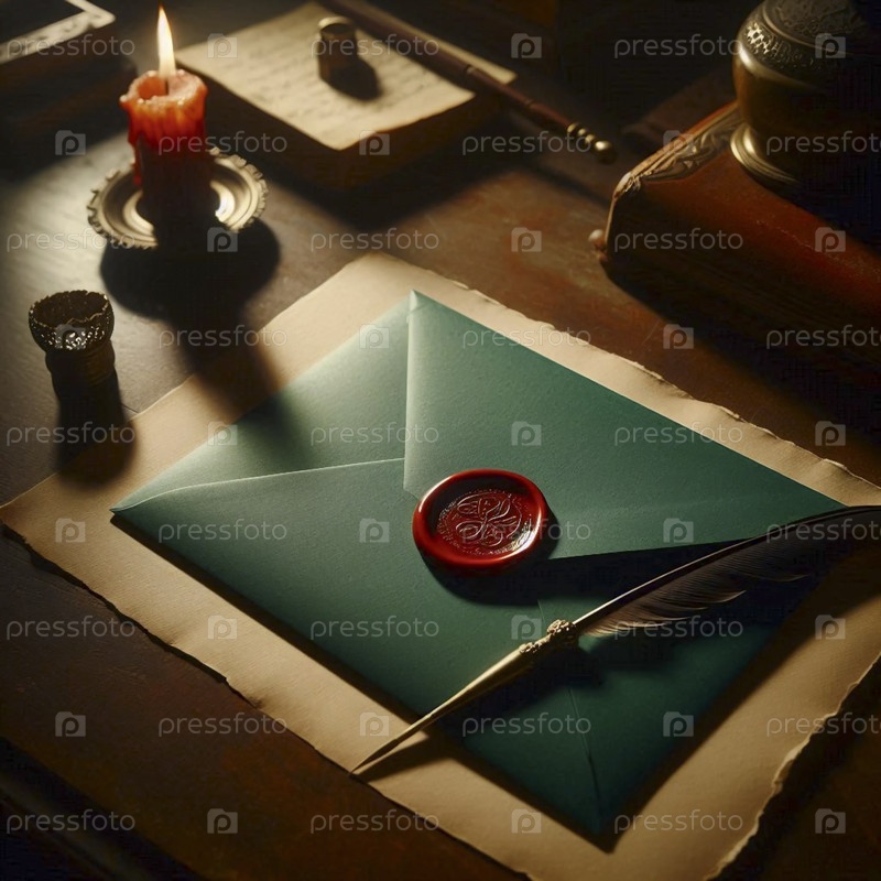 Мокет темно-зеленого конверта с пустой, красной восковой печатью на столе с пернатым песком Ai generated image