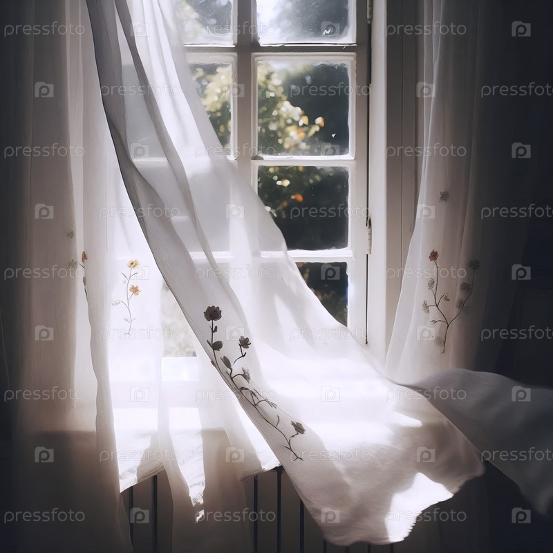 Пара вышитых льняных штор, мягко дующих в ветре от открытого окна, раскрывая солнечный сад, Ай создала изображение