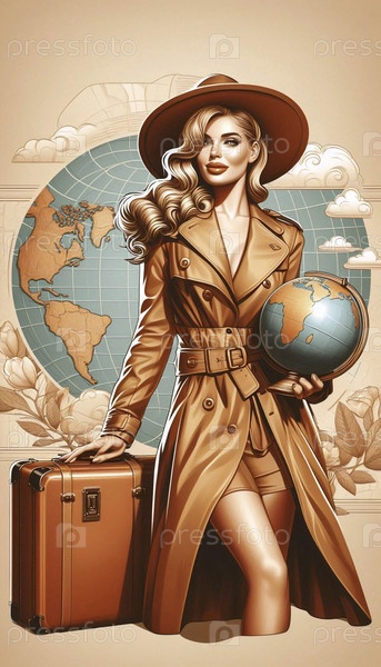 Пин-ап девушка с чемоданом и земным шаром, готовая к приключениям, Ai generated image