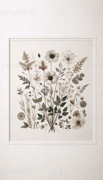 A dried flowers herbarium art print, Ai generated image А сушеные цветы гербария художественная печать, Ай создал изображение