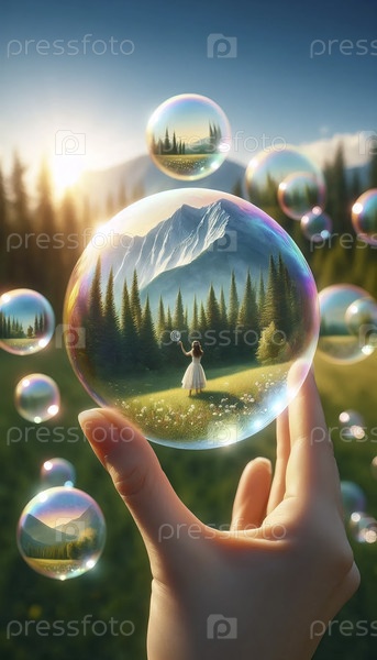 Мыльные пузыри, содержащие пейзажи акварели, Ai generated image