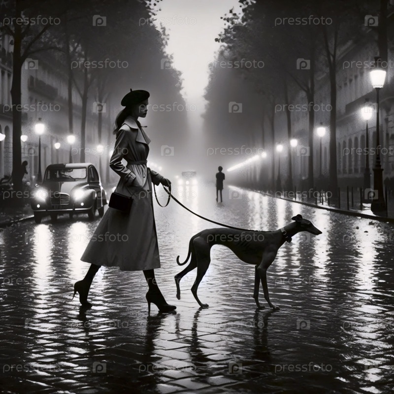 Женщина с собакой на дождливой улице, Ai generated image