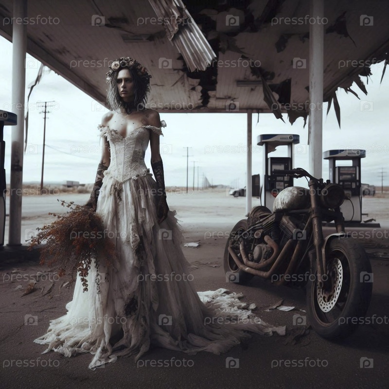 Постапокалиптическая невеста на заправочной станции, Ai generated image