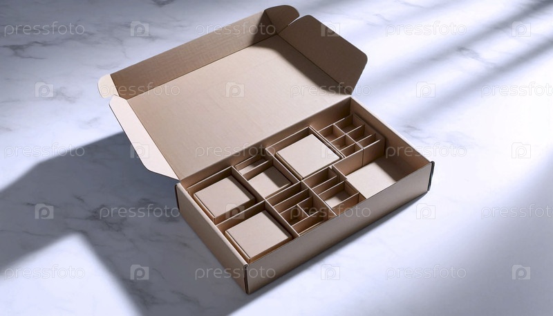 Открытый пустой макет подписной коробки с внутренними отсеками на мраморном столе, Ai generated image