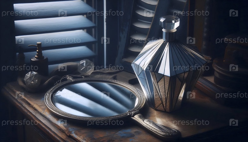 Мокет бутылки, вдохновленный искусством деко, опирающийся на запятнавшееся серебряное ручное зеркало на тщеславии, Ai generated image