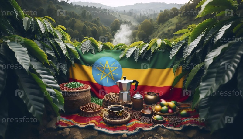 Эфиопский флаг на церемонии кофе и фермах в высокогорных районах, Ai generated image
