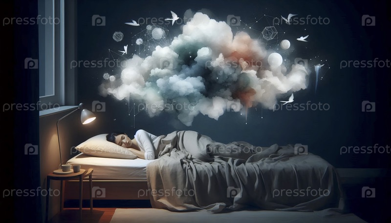 Облако снов, плавающее над спящей женщиной, Ai generated image