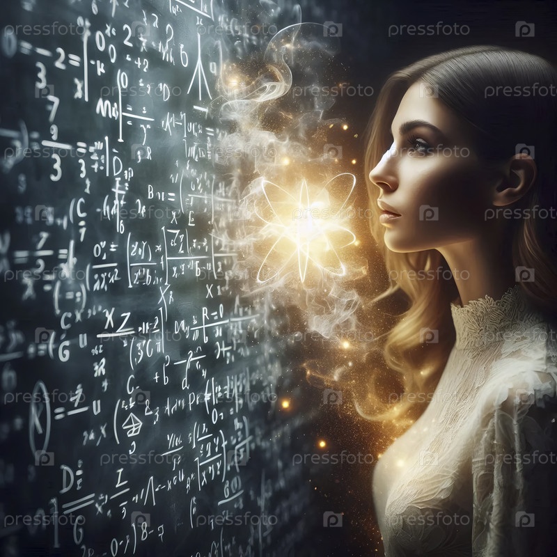 Женщина, окруженная светящимися математическими формулами, Ai generated image