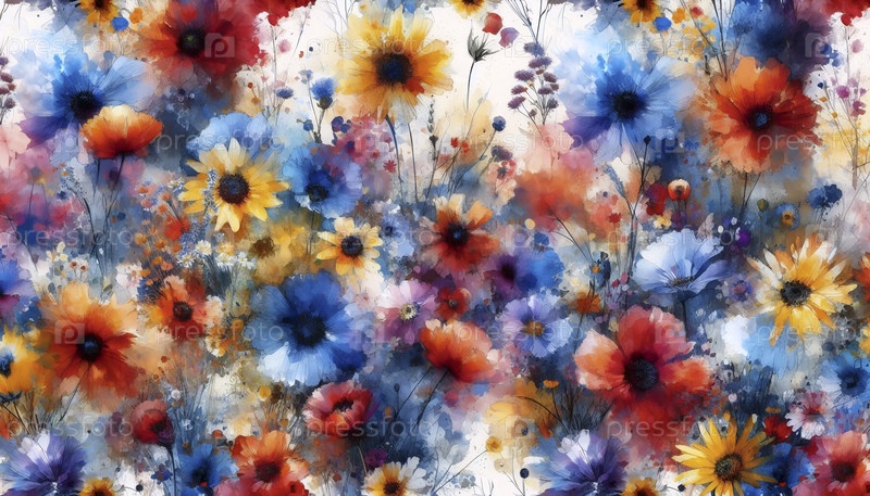 Акварель дикие цветы яркие художественные узоры плавный дизайн, Ai generated image