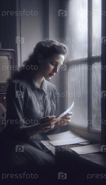 Женщина читает любовное письмо времен войны у окна, Ai generated image