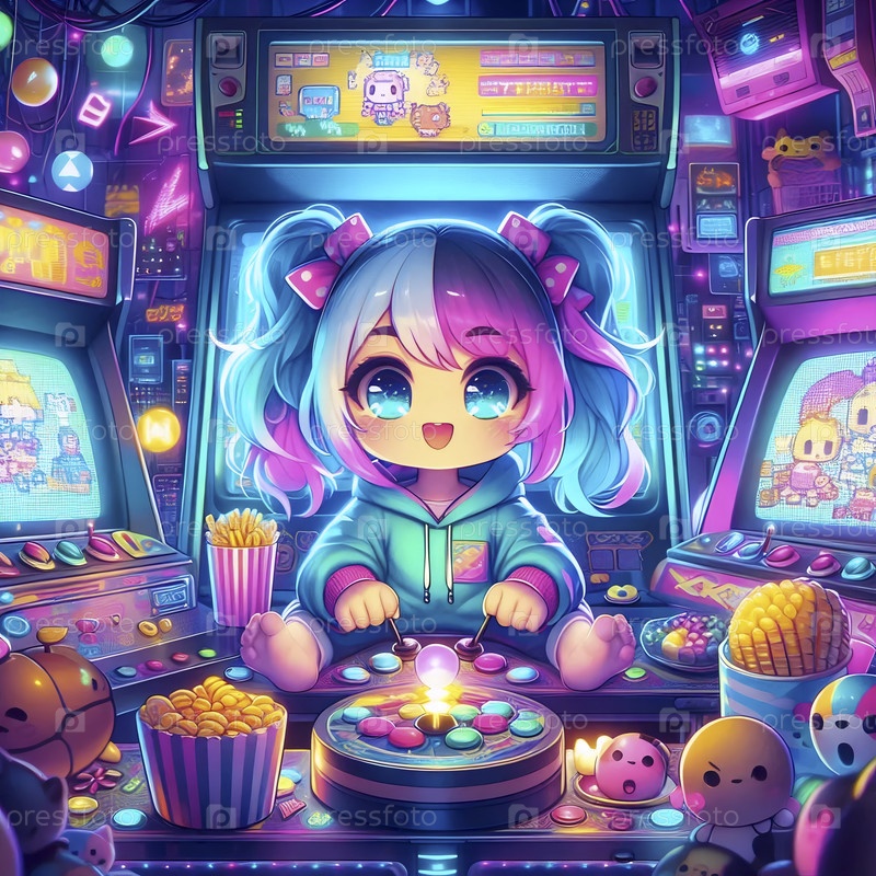 Подробная сцена кавайи в виртуальной аркаде, Ai generated image