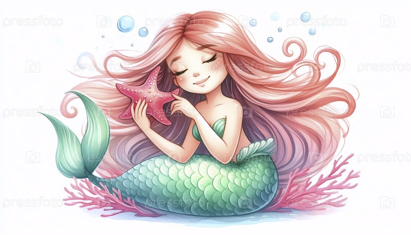 Русалка, чистившая волосы акварельной краской из звездной рыбки, Ai generated image