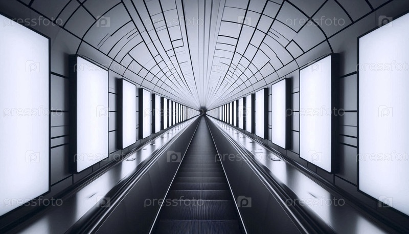 Вертикальный последовательный макет панели проходит рядом с пустым движущимся эскалатором на современной станции метро, Ai generated image