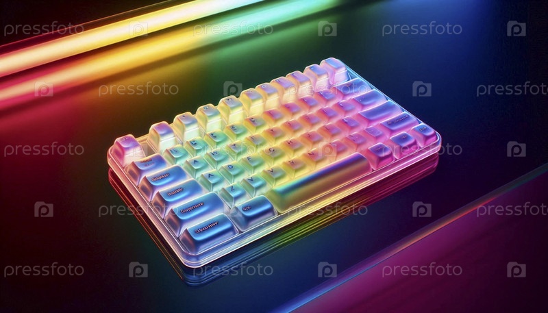 Прозрачный макет кожи клавиатуры с радужным гелем, установленный на стеклянном столе, Ai generated image