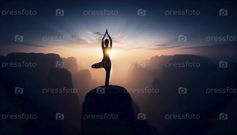 Силуэт йоги находит баланс на скалистом обрыве при восходе солнца, символ осознаваемой силы, Ai generated image