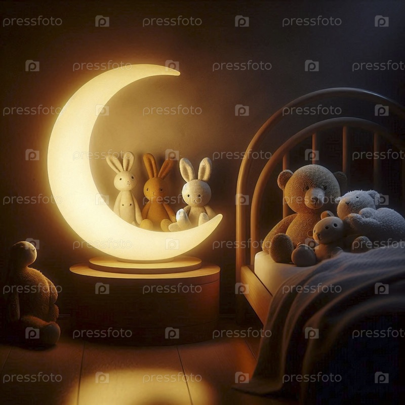 Нежный ночной свет в форме луны, бросающий мягкое свечение на спящих младенцев плюшевых животных, Ai generated image