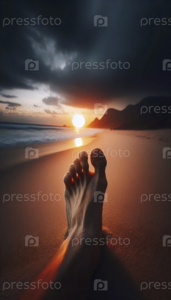 нога против пляжа захода солнца
