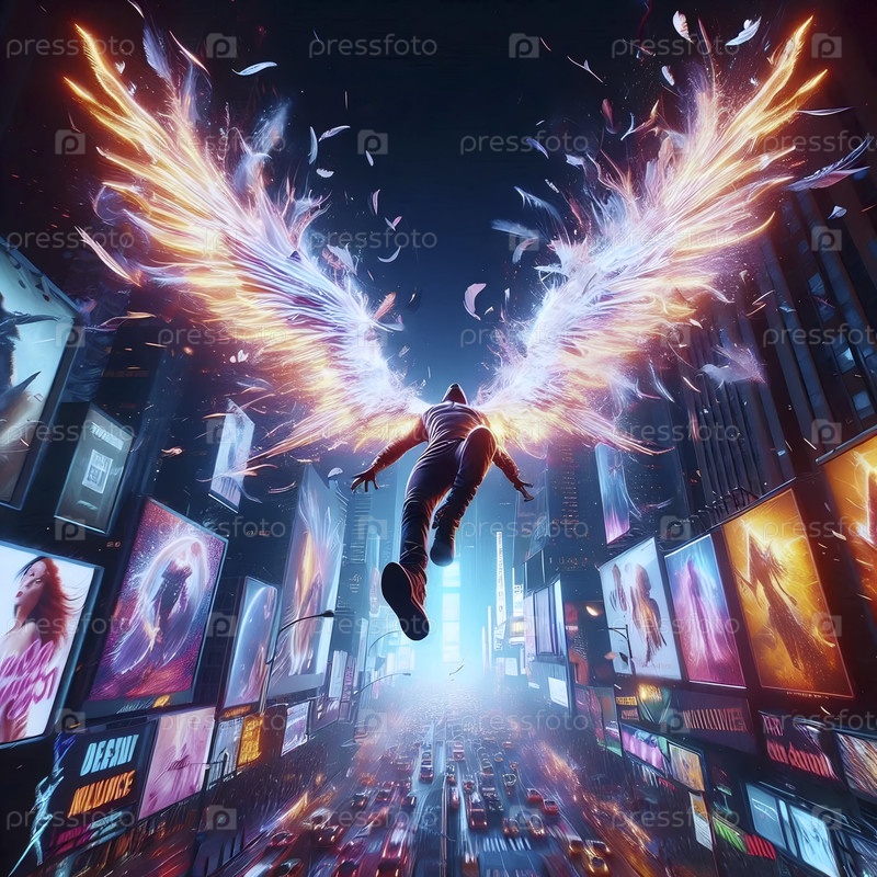 Ангел падает через Таймс-сквер Биллборд, Ai generated image