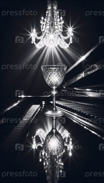 Хрустальная чашка шампанского на крышке фортепиано, Ai generated image