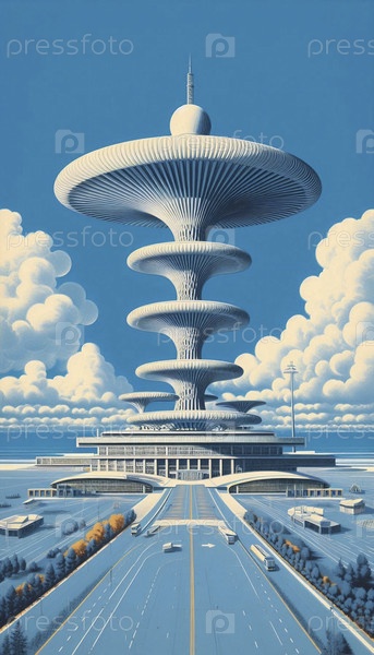 Колоссальная коммуникационная башня в стиле Googie, напоминающая замороженный атомный взрыв, пробивающая облака
