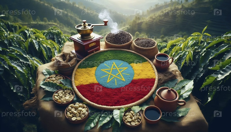 Эфиопский флаг на церемонии кофе и фермах в высокогорных районах, Ai generated image