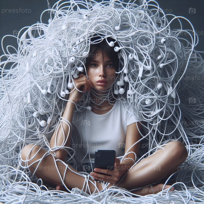 Женщина, запутавшаяся в паутине проводов для наушников, Ai generated image