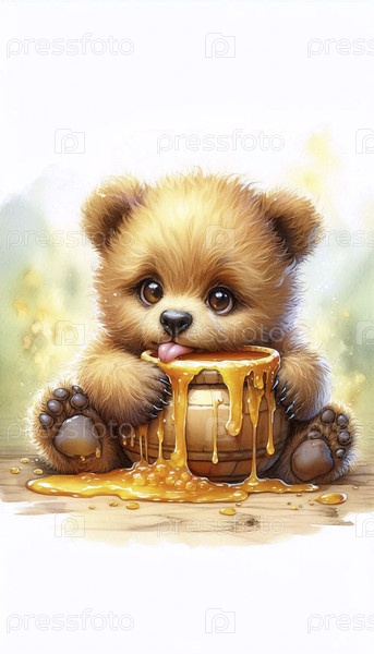Медвежонок с медовой кастрюлей Акварельный арт-принт, Ai generated image