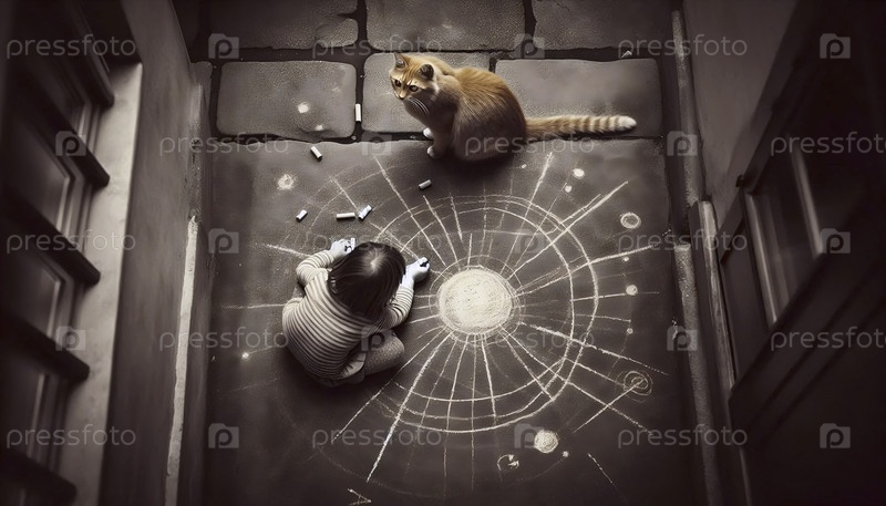 A cat observing a child's earnest sidewalk chalk universe, Ai generated image Кошка наблюдает за ребенком на тротуаре