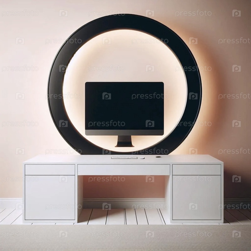 Минималистский белый макет рабочего стола с большим кольцевым светом, отражающимся на пустом экране монитора против пастельной стены, Ai создал изображение