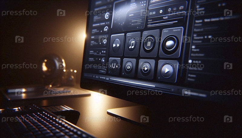 Макет приложения для настольного аудиоплеера на экране компьютера, с пустым списком воспроизведения и элементами управления плеером, Ai generated image