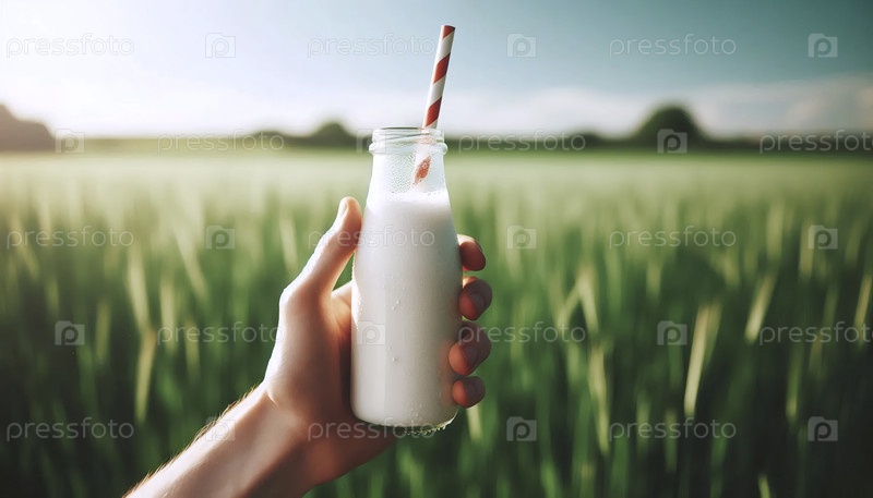 Ближайший план руки, держащей прозрачную стеклянную бутылку с молоком со смелой красно-белой бумажной соломой, Ай создал изображение