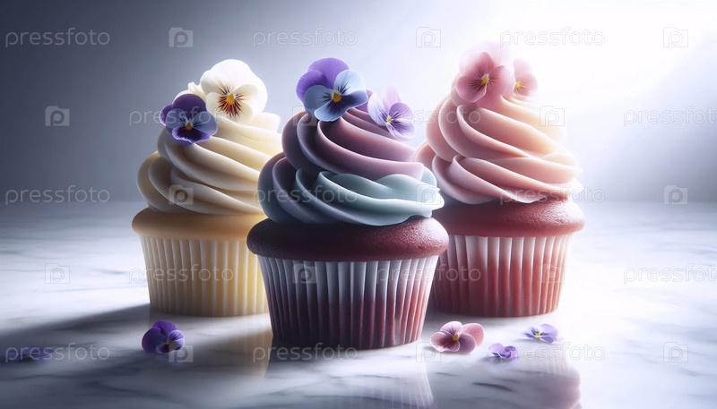 Стол из трех вкусных, безупречно замороженных кексов с небольшим количеством съедобных цветов на мраморной плите Ai создал изображение
