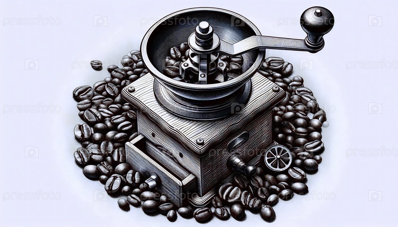 Кофейная мельница и бобы чернила для рисования художественный печат, Ai generated image
