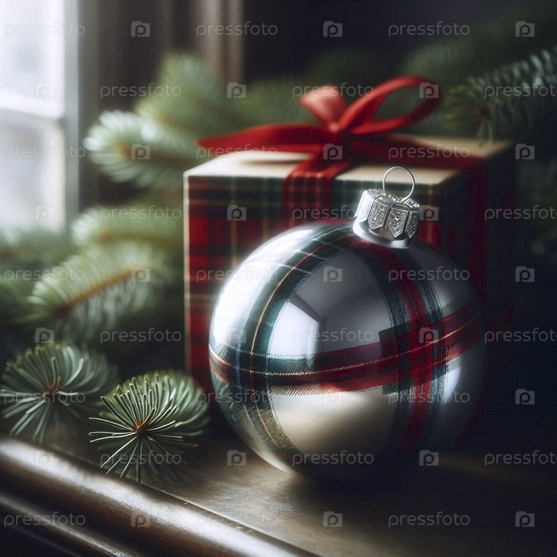 Мокет праздничного украшенияПростой, пустый стеклянный мокет расположен рядом с упакованной в тартан подарочной коробкой на камине, Ai generated image