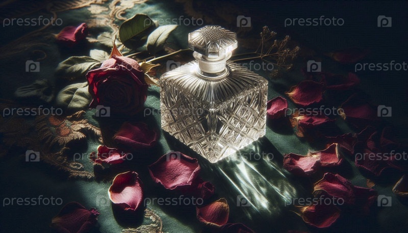 Макет пустой кристаллической бутылки, наполовину похороненной в постели сушеных листьев роз, Ai generated image