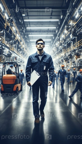 Более широкий кинематографический снимок окружающей среды, сделанный на хаотичном заводском этаже, заполненном машинами во время смены смен, Ai генерирует изображение