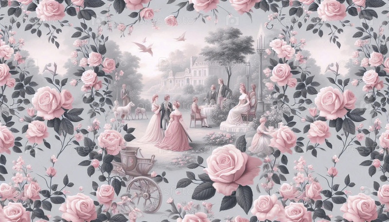 Розовый цветочный бесшовный рисунок Toile-de-Jouy, Ai generated image