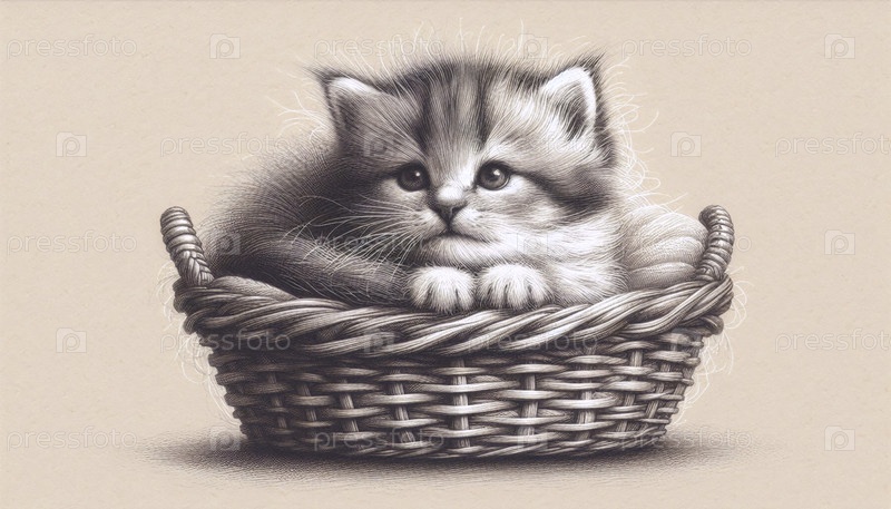 A kitten in a wicker basket ink drawing art print, Ai generated image Котенок в плетеной корзине чернил рисование художественное печать, Ай создал изображение