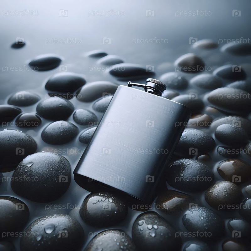 Мокет бутылки из нержавеющей стали на гранитном пляже, Ai generated image
